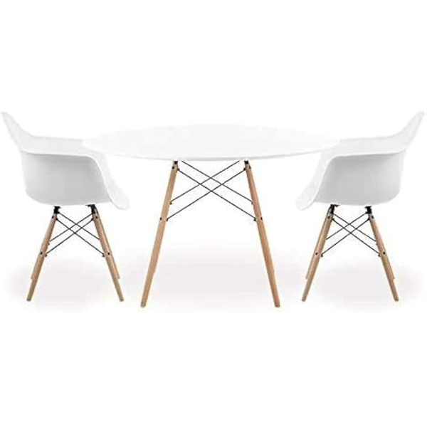 This Eames Dining Table and 2 White DAW Armchairs Set from AWF AL WADI FURNITURE combines the iconic Eiffel struts and wooden dowel base with a contemporary white table top with complementary chairs.