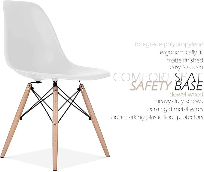 This Molded Plastic Dining Shell Chair with Natural Wood Eiffel Legs will provide great indoor seating for family and guests. Sporting a futuristic yet retro look at the same time, this chair will be a great addition to any kitchen or dining room area. Constructed of heavy duty matte finish seat.