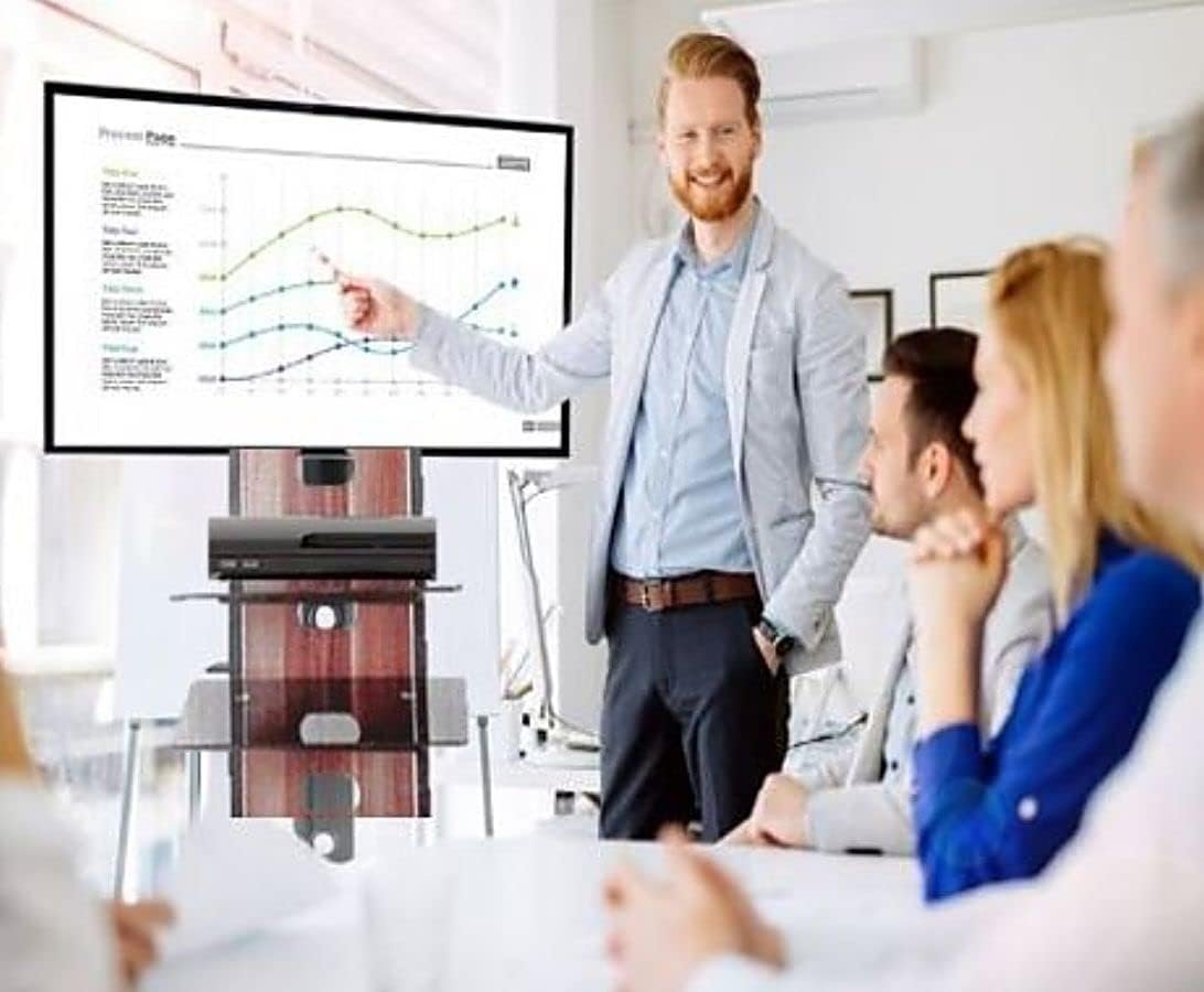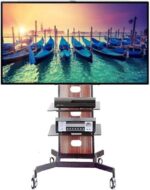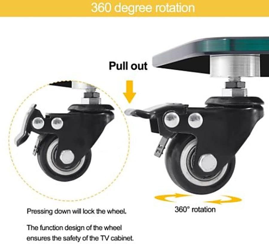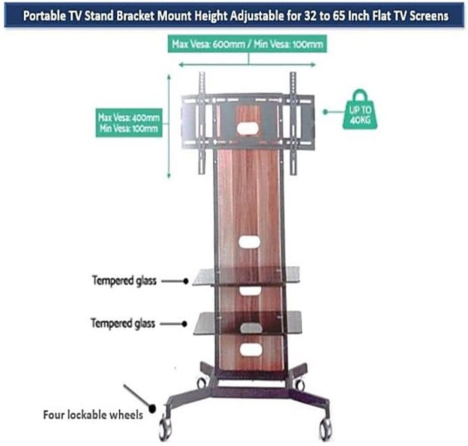 - Height Adjustment: This mobile stand has four wheels, all featuring locking casters. The Height of the TV Mount Stand is Adjustable upto TV of 65 Inches. The tv cart has 4 wheels with brakes on front side make the TV stand cart stationary or mobile when desired, lets you move your monitor or tv around your home or office with ease.