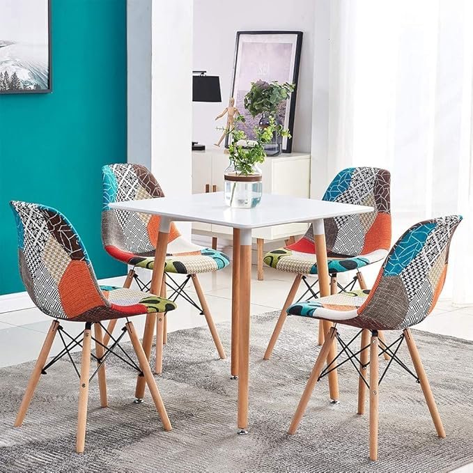 Square Dining Table and Patchwork Chairs Set of 4, 1 Piece Kitchen White Wooden Dining Room Table with 4 Fabric Cushioned Colorful Chairs