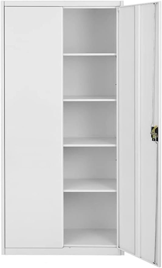 - Tall steel storage cabinet with 4 adjustable shelves, 2 keys highly protect & prevent belongings from temperature, dirt.
