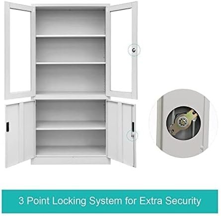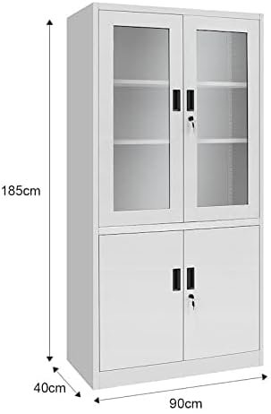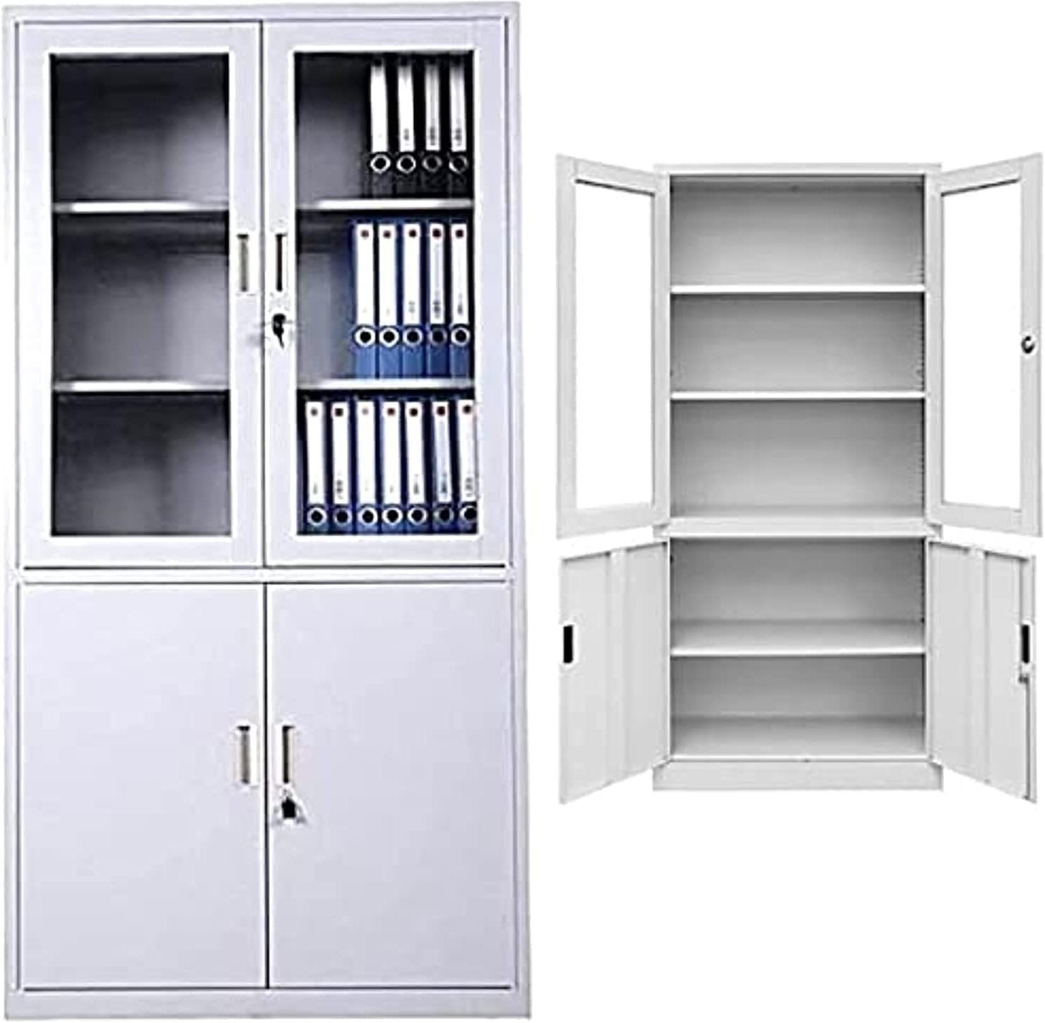 Two Doors Upper Glass and Two Doors Lower Lockable Steel Cabinet with Interior Steel Racks, Shelves Storage for Living Room,Kitchen,Office,School,Study – GREY