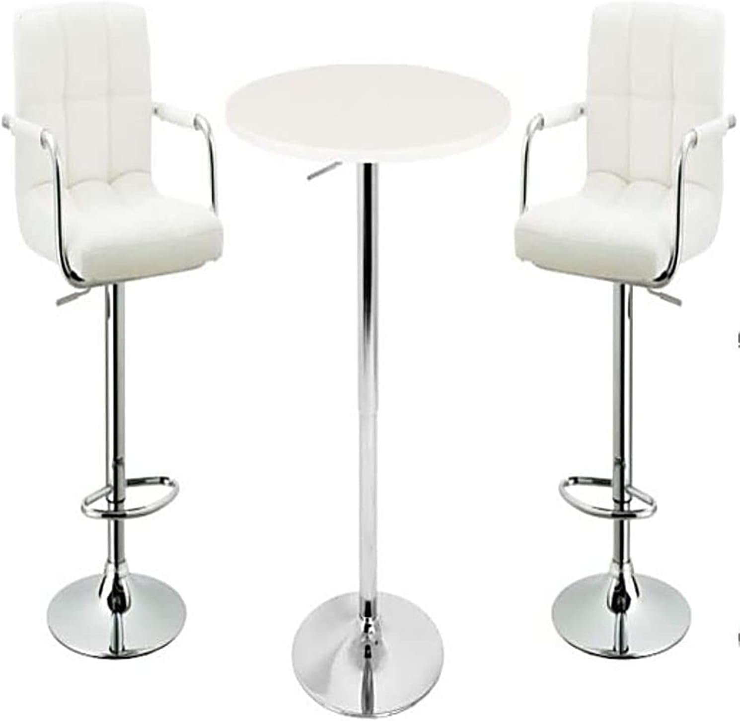 Add this lovely bar table to your entertainment room for a touch of chic contemporary style. The smooth round table rests above a sturdy chrome finished metal base. A white finished laminate top, pull up your favorite bar stools and you’re ready for a party. The MDF Wood top will withstand heavy use while maintaining its simple and easy to clean look.The Bar stools are made of High density foam upholstered in white faux leather; Metal with PU Leather on Top on arms, Constructed with polished chrome base and footrest.