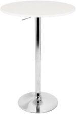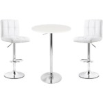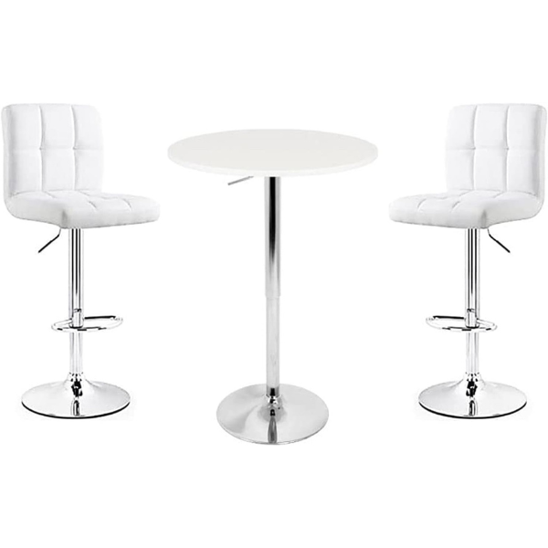 Add this lovely bar table to your entertainment room for a touch of chic contemporary style. The smooth round table rests above a sturdy chrome finished metal base. A white finished laminate top, pull up your favorite bar stools and you’re ready for a party. The MDF Wood top will withstand heavy use while maintaining its simple and easy to clean look.The Bar stools are made of High density foam upholstered in white faux leather; Constructed with polished chrome base and footrest.