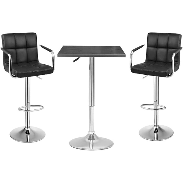 Stylish and Contemporary 3-Piece Adjustable Swivel Square Bar Table with Two Bar Chairs with Armrests – BLACK