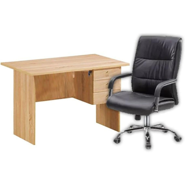 This AWF AL WADI FURNITURE is an Ideal Office Set for for small rooms or limited spaces, it has plenty of storage space and doesn’t take up much room. It’s an excellent choice for you to work in your office room or for your children to study as a writing desk in your family. The spacious tabletop of this computer desk can provide enough workspace. The open design makes cable management easy for you to arrange your laptop, host, and monitor.It also comes with Lockable Top Drawer. The Office Desk Chair Offers Superior Comfort Throughout The Working Day Thanks To The Leather Padded Chrome Arm Supports