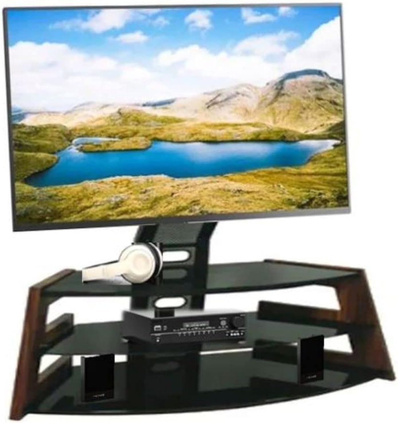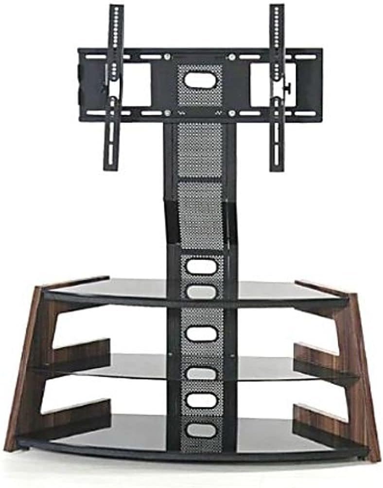 Height Adjustable Curvy 3-Tier Tempered Glass Steel TV Mount Stand with Wooden Frame, Oak Brown, 120H x 120W x 40D cm