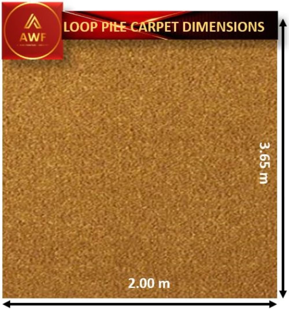 - Gold Color Loop Pile Carpet Dimensions – 3.65W x 2L metres (Carpet Thickness 4 mm (+ – 0.5mm). Usage in Hotel, Suite, Room, Mosque, Conference, Lobby, Hallway, Corridor, Meeting Room, Casino, Club, Bar, Restaurant, Cinema, Theatre, Public Areas. The Carpet color might vary slightly due to photographic lighting and photoshop sources.