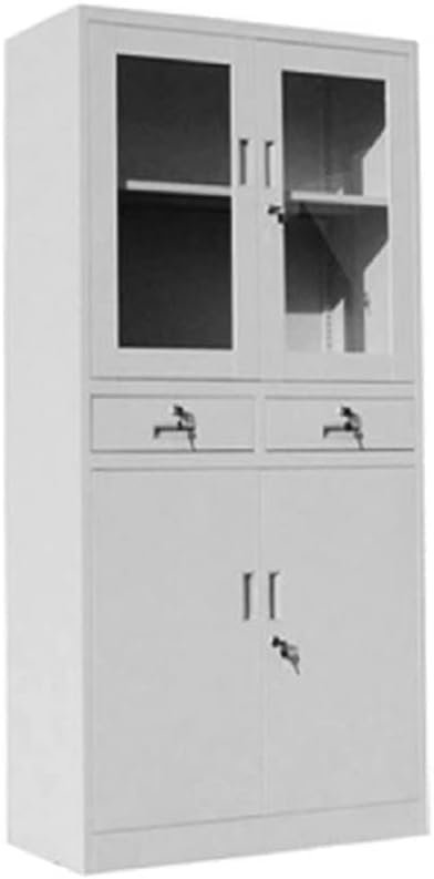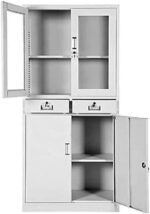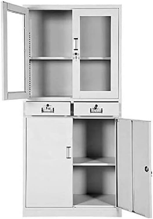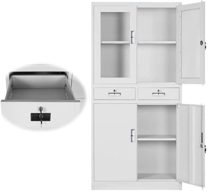 Two Doors Upper Glass,Two Lockable Center Drawers and Two Lower Doors Steel Cabinet Interior Steel Racks,Shelves Storage for Living Room,Kitchen,Office,School,Study- GREY