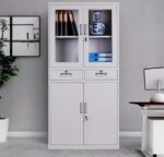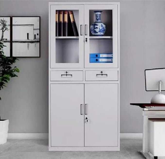 The AWF AL WADI FURNITURE sturdy metal cabinet with 2 sections, and double swinging doors in each section. There are shelves in each section for maximum utilization of space. All doors are lockable for the security of important items. Top 2 doors have tempered glass window, which helps you find the files you want easily. It also includes Two Middle Lockable Drawers with 3 sections ball bearing runners ensure smooth opening and closing, even under increased load while storing valuables securely.
